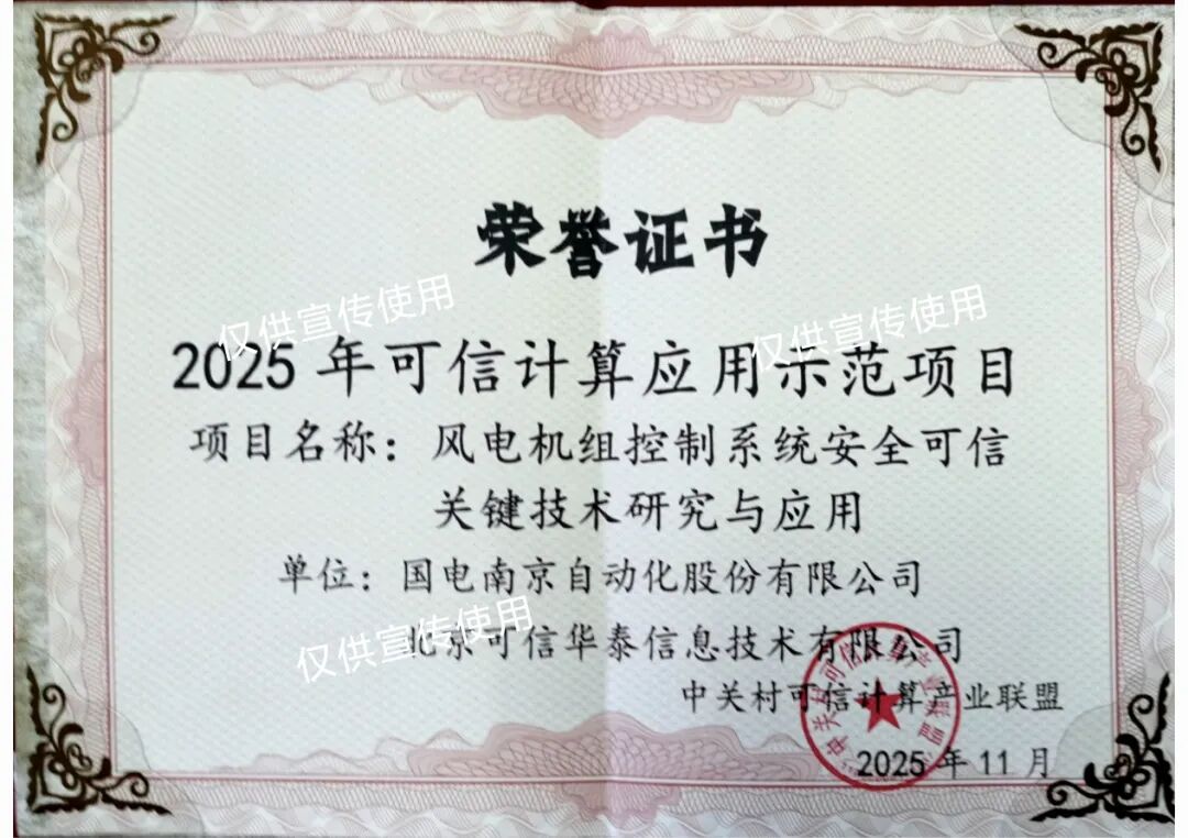 近日,由 国电南自 与 中国电子集团 旗下 北京可信华泰信息技术有限公司 联合攻关的“风电机组控制系统安全可信关键技术研究与应用”项目成功入选《2025年可信计算示范应用项目名单》,成为风电行业首家获此殊荣的项目单位,标志着可信计算关键技术在风力发电领域实现重大技术突破,填补了行业相关应用空白。