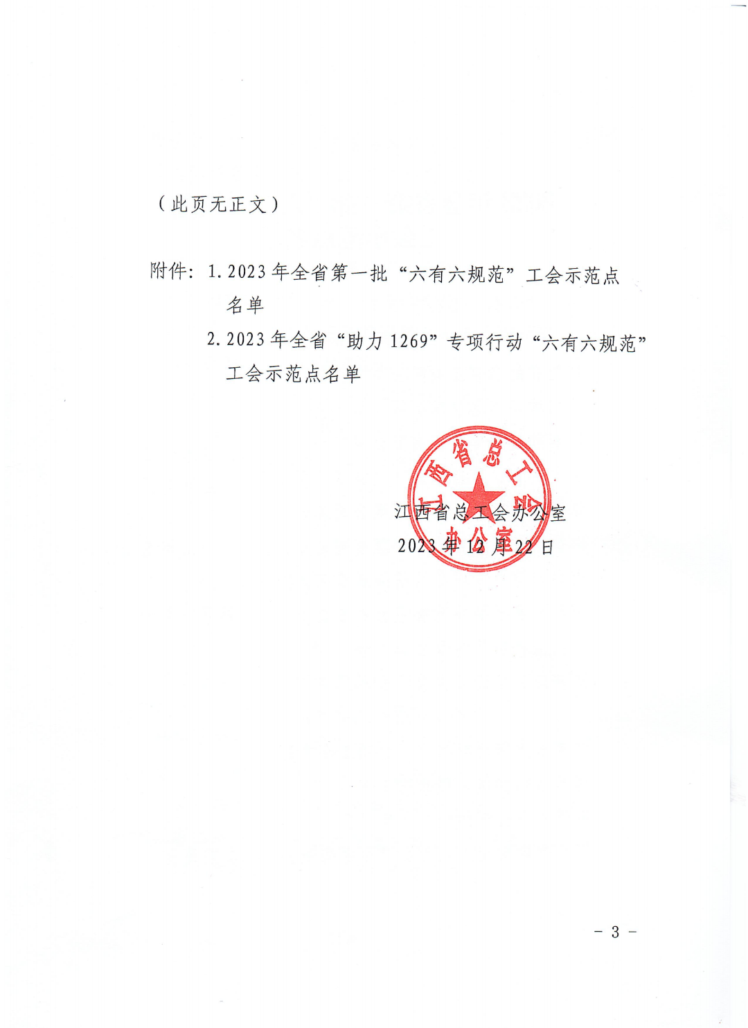 近日,江西省总工会发布《关于确定2023年全省“六有六规范”工会示范点的通知》(赣工办发〔2023〕87号),赣粤高速工会榜上有名,荣获2023年第一批“六规范”工会示范点。