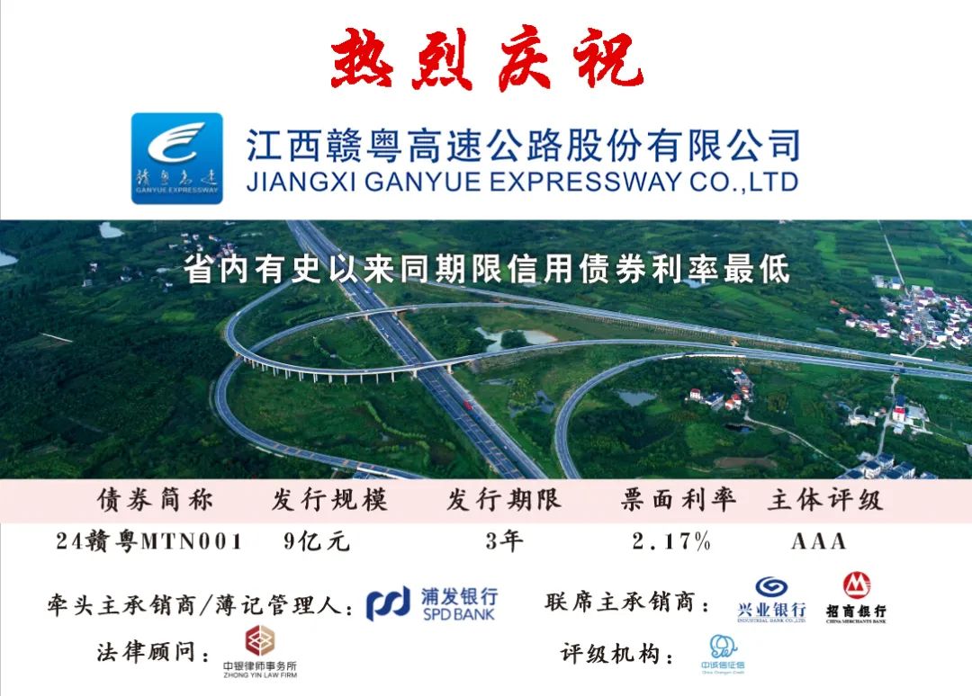 近日,赣粤高速成功发行9亿元中期票据,期限3年,票面利率2.17%,创江西省内有史以来同期限信用债券利率新低,近三年全国同期限信用债券利率新低。