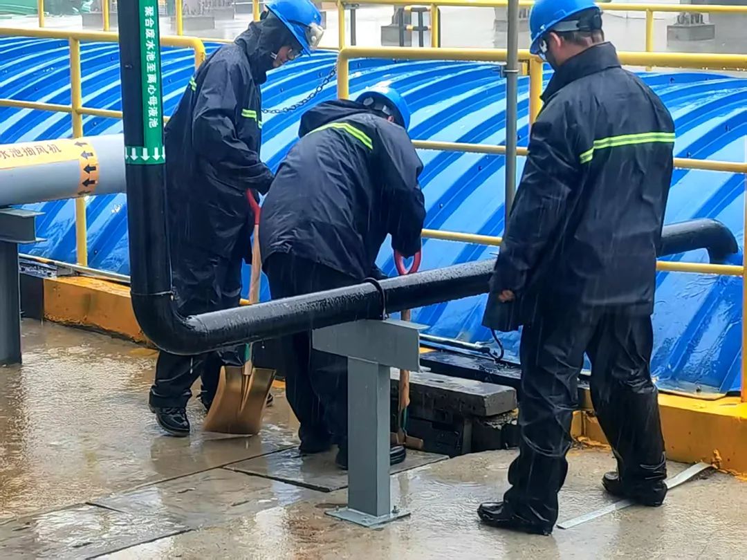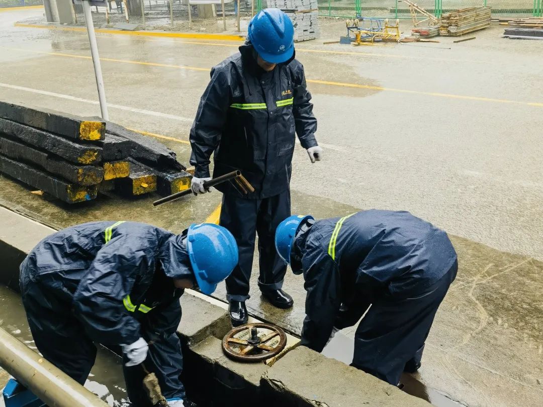 技术团队实时监控设备运行状态,确保特殊情况第一时间处置,保障生产平稳运行。应急抢修队伍全员随时待命,检修人员重点对生产装置、储罐区、电力设施等关键部位进行加固防护,提前疏通排水系统,清理现场可移动杂物,临时固定装卸站台鹤管,备足应急物资。