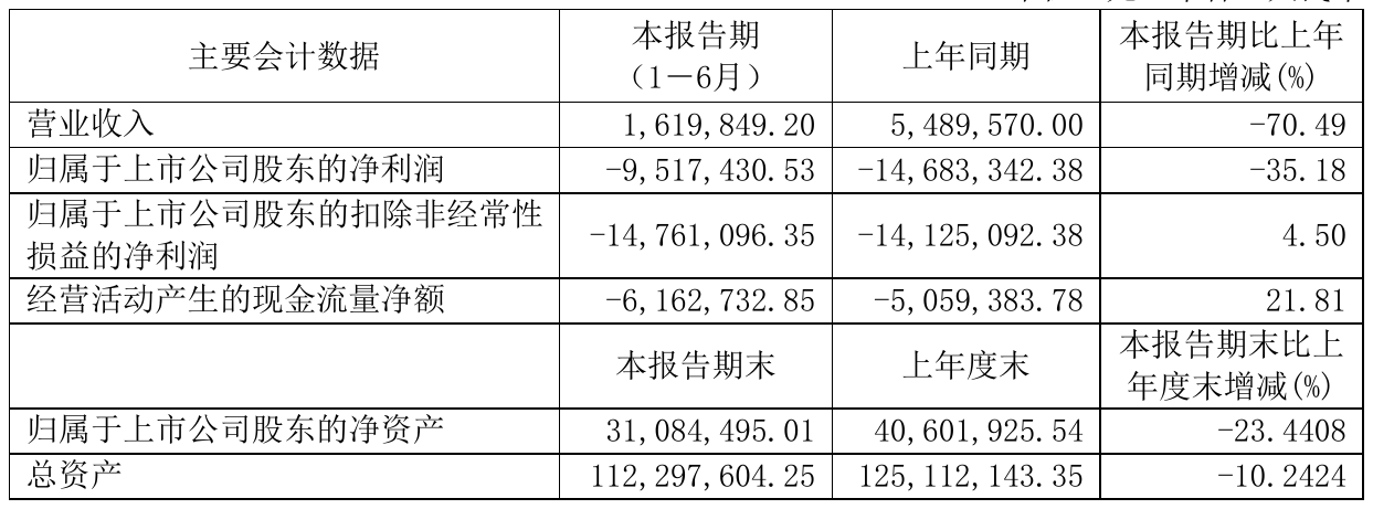 挖贝网8月31日,*ST昌鱼(600275)近日发布2021年半年度报告,报告期内营业收入1,619,849.20元,同比减少70.49%;亏损9,517,430.53元,同比亏损减少35.18%。
