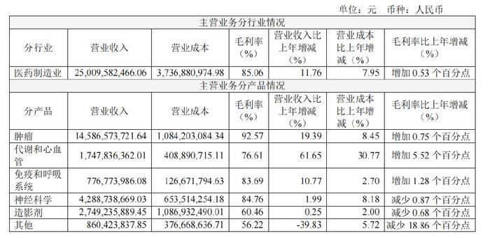 分产品看,2024年公司肿瘤药物贡献146亿元,代谢及心血管领域以61.65%的增速成为黑马,主要因恒格列净等产品借医保放量。