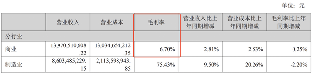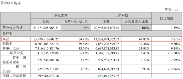 为什么会如此?这同华东体内一块最被市场忽视的业务有关。下图是公司的半年度营收来源,有一项占总营收比例近65%的医药商业业务,其实就是医药流通,把它理解成物流+批发即可,这块业务看似营收很高,但毛利极低,6.7%的毛利简直少得可怜,虽然占了极大的营收比例,但对利润的贡献少得可怜。