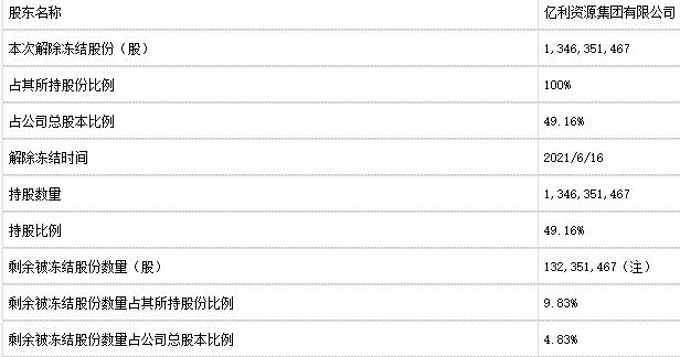 亿利洁能于6月19日发布的《亿利洁能关于股东所持公司股份冻结与解冻的进展公告》显示,亿利集团因与平安银行股份有限公司青岛分行发生保理担保纠纷,根据山东省青岛市中级人民法院出具的《民事裁定书》,亿利集团所持本公司13.46亿股无限售条件流通股被冻结。近日,亿利集团已与平安银行达成和解,平安银行已申请解除对亿利集团所持公司全部股份的冻结,并办理了股份解除冻结手续,根据中国证券登记结算有限责任公司上海分公司《股权司法冻结及司法划转通知》(2021司冻0616-2号),亿利集团持有的公司13.46亿股股份已解除冻结。