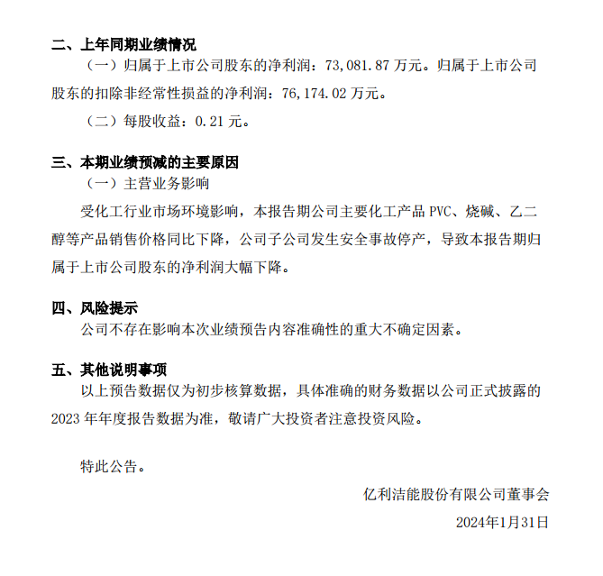 近日,亿利洁能发布2023年年度业绩预减公告。公司预计2023 年度实现归属于上市公司股东的净利润 3,645 万元到 5,286 万元,与上年同期(法定披露数据)相比,将减少 69,436.87 万元到 67,795.87 万元,同比下降 95.01%到 92.77%。