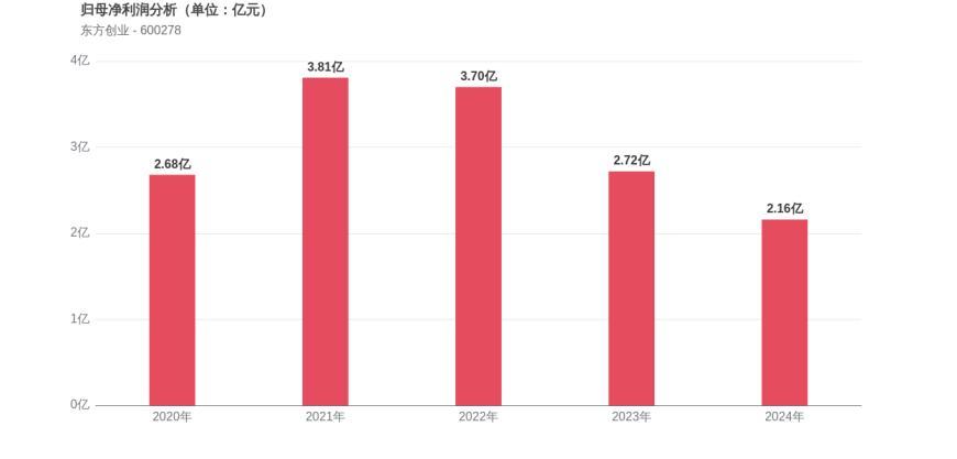 利润角度分析,2020年东方创业实现归母净利润2.68亿元,2024年2.16亿元。近年来归母净利润持续下降,盈利水平有所承压。