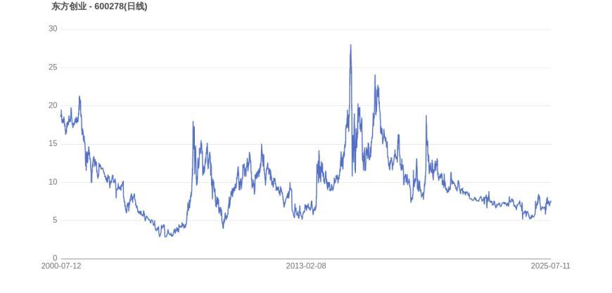 2015年6月11日,东方创业的市值巅峰达到149.73亿元,股价也顺应升至28.67元。而至7月11日收盘,东方创业的股价为7.54元,市值为66.14亿元,相比峰值时期市值减少83.59亿元,市值蒸发了55.83%。