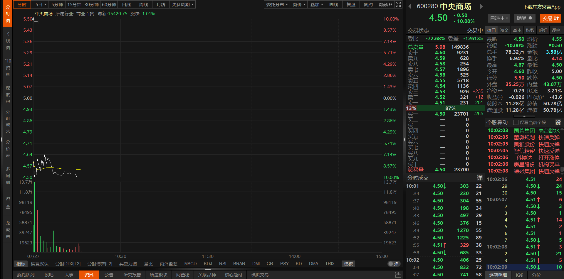 7月27日,市场热度较高的零售股中央商场开盘后股价即走弱,更一度触及跌停。截止发稿,中央商场报4.50元,跌10.00%,成交3.56亿元,买方仅剩买一价尚有超过2万手挂单。