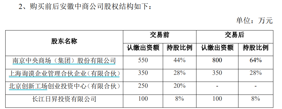 2018年10月,为更好地整合便利业务资源,引进外部资金,实现安徽便利股权多元化的治理结构,中央商场董事会审议通过《关于控股子公司增资的议案》,安徽中商罗森与创新工场签订增资协议,创新工场拟出资6000万元,获得20%股权。