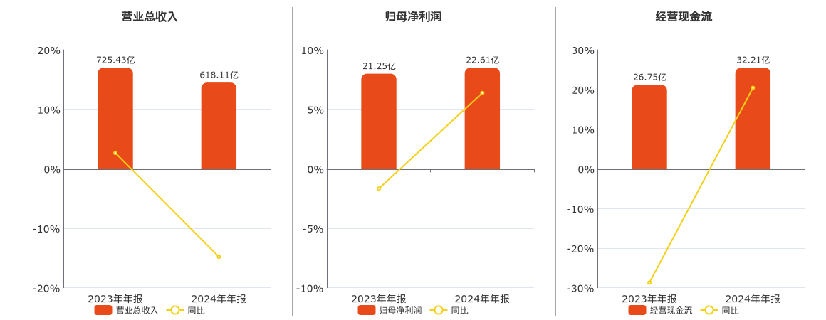 公司营业总收入为618.11亿元。归母净利润为22.61亿元,较去年同报告期归母净利润增加1.35亿元,同比较去年同期上涨6.37%。经营活动现金净流入为32.21亿元,较去年同报告期经营活动现金净流入增加5.46亿元,同比较去年同期上涨20.39%。
