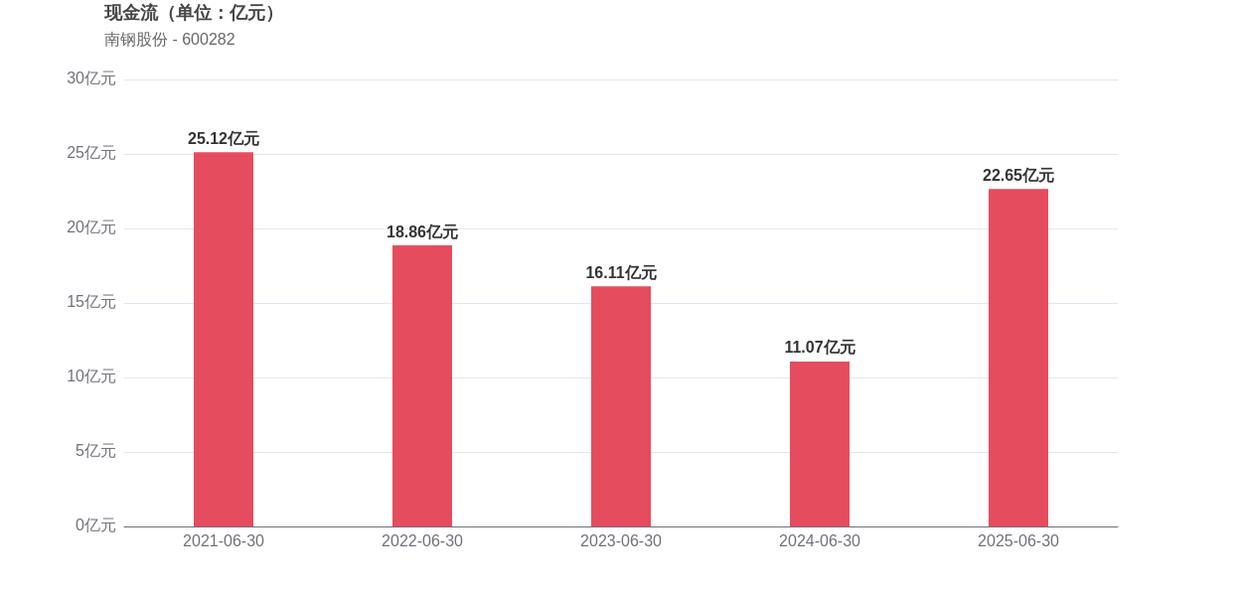 在经营稳健性方面,南钢股份面临存货周转效率略有放缓的情况,存货周转天数为56.42天,较2024年上半年增长了5.91%,表明公司在存货管理方面仍有优化空间。经营活动产生的现金流净额为22.65亿元,相比2024年同期的11.07亿元,同比增长了11.58%。此外,2025年上半年的资产负债率为59.57%,同比下降了0.99个百分点,这意味着公司负债总额占资产总额的比重在减少,财务结构趋于稳健。