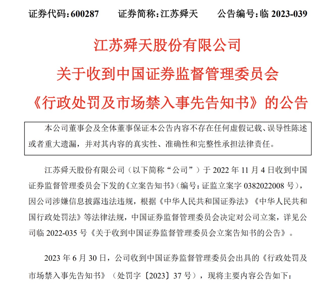 除了重磅罚单的落地,《眼镜财经》还注意到,在收到证监会处罚的同时,上交所还对江苏舜天下发了监管工作函,处分日期是7月2日,涉及对象包括了上市公司、董事、监事、高级管理人员。