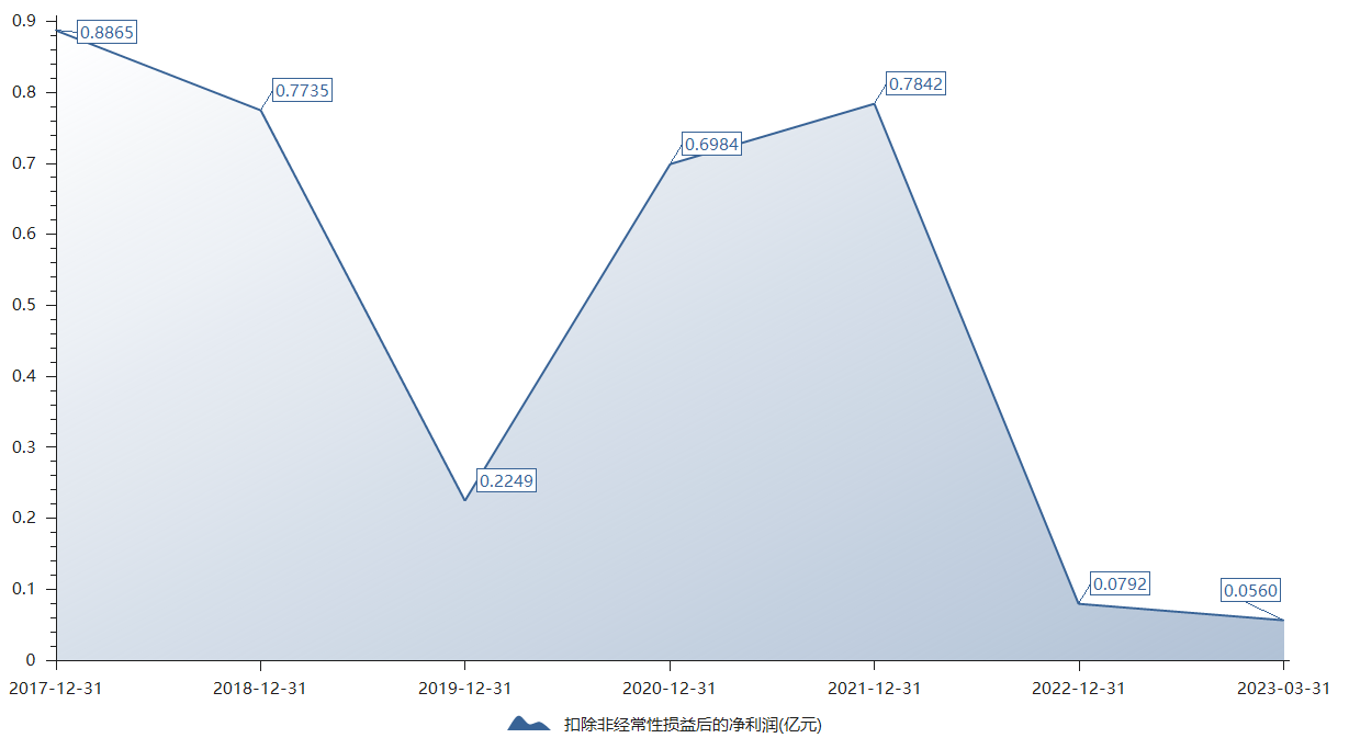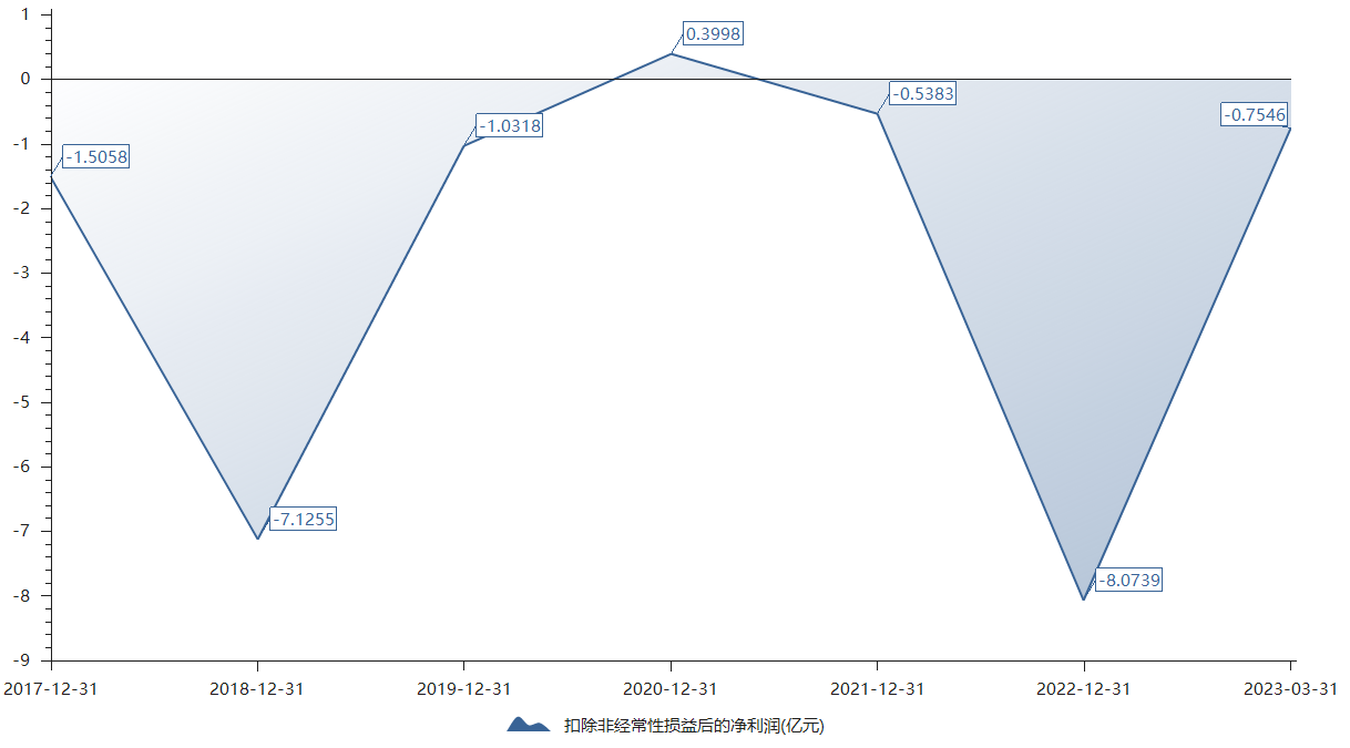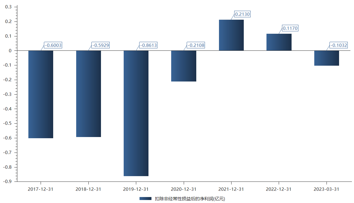 进入2023年该公司扣非后归母净利依旧大亏。公司预计2023年上半年归母净利为1.33亿元至1.59亿元,然而扣非后归母净利则亏损1.33亿元至1.11亿元。