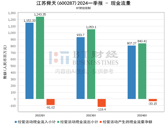 在现金流量数据方面,江苏舜天的经营活动现金流入小计为8.07亿元,同比下降了13.54%;经营活动现金流出小计为8.4亿元,同比下降了20.17%。经营活动产生的现金流量净额为-33.15百万元,显示出公司在经营活动中的现金流压力。部分业务去年同期应付票据到期集中付款是导致现金流出较大的原因之一。此外,筹资活动产生的现金流量净额有所增加,主要是由于报告期内公司对于银行融资的借款增加且还款金额减少。