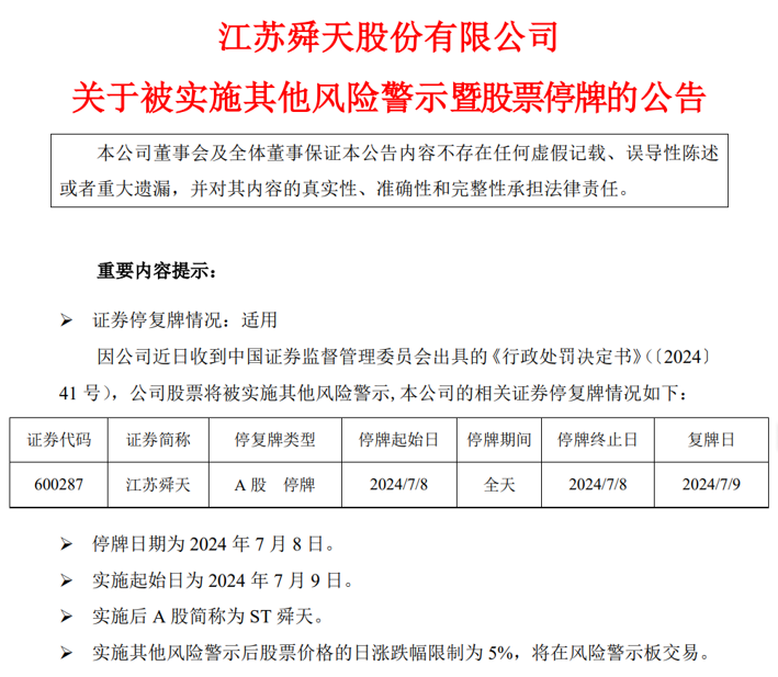 2022 年 4 月 30 日,江苏舜天发布《江苏舜天股份有限公司关于会计差错更正的公告》,将通讯器材业务的收入确认方法由总额法调整为净额法,对 2009年至 2020 年年度报告进行了追溯调整,该公告中调整后的财务数据仍存在虚假记载。