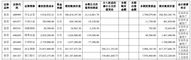 不过,江苏舜天整体炒股战绩欠佳。截至上半年末,江苏舜天持有华安证券股票账面价值为1.04亿元。今年上半年,该股公允价值变动损益为-411.49万元,在所持有的股票中亏损幅度最大。此外,中国石油、鸿路钢构、赣粤高速、中国铝业(601600.SH)的公允价值损益均出现不同程度亏损。