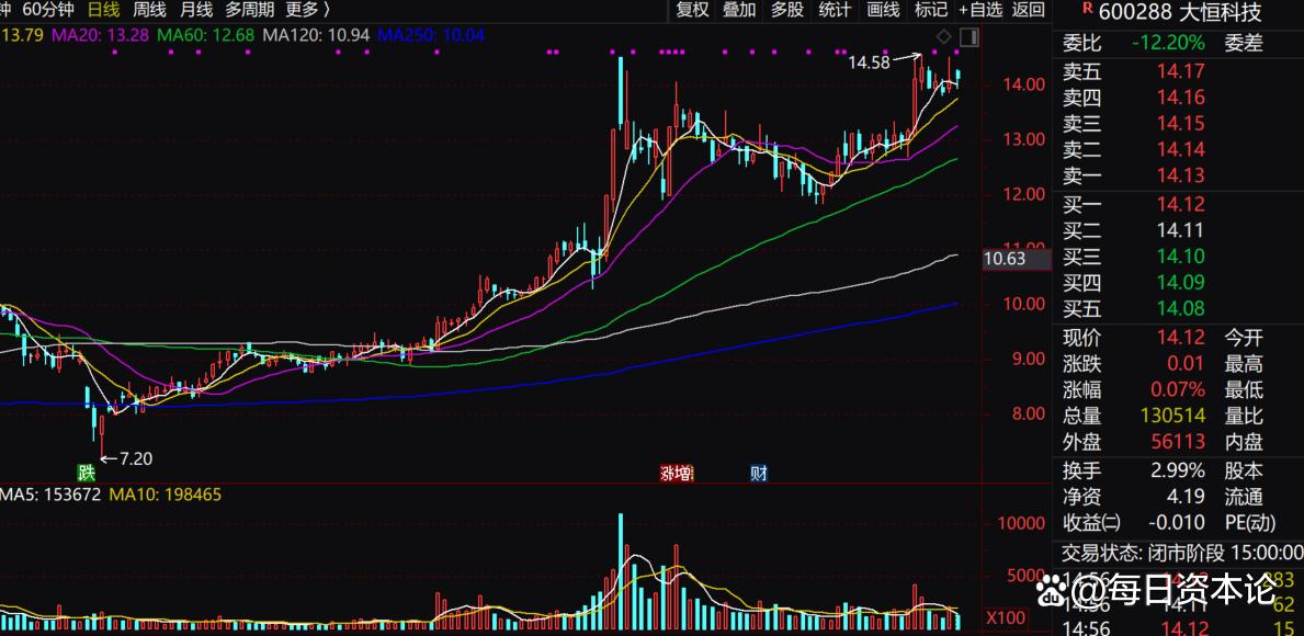 资本市场给予了积极回应。大恒科技股价自今年4月9日探底7.2元/股后,其走势十分强劲,至9月25日其股价已成功翻倍,最高14.58元/股。截至10月10日收盘,大恒科技股价为14.12元,依然在高位震荡。