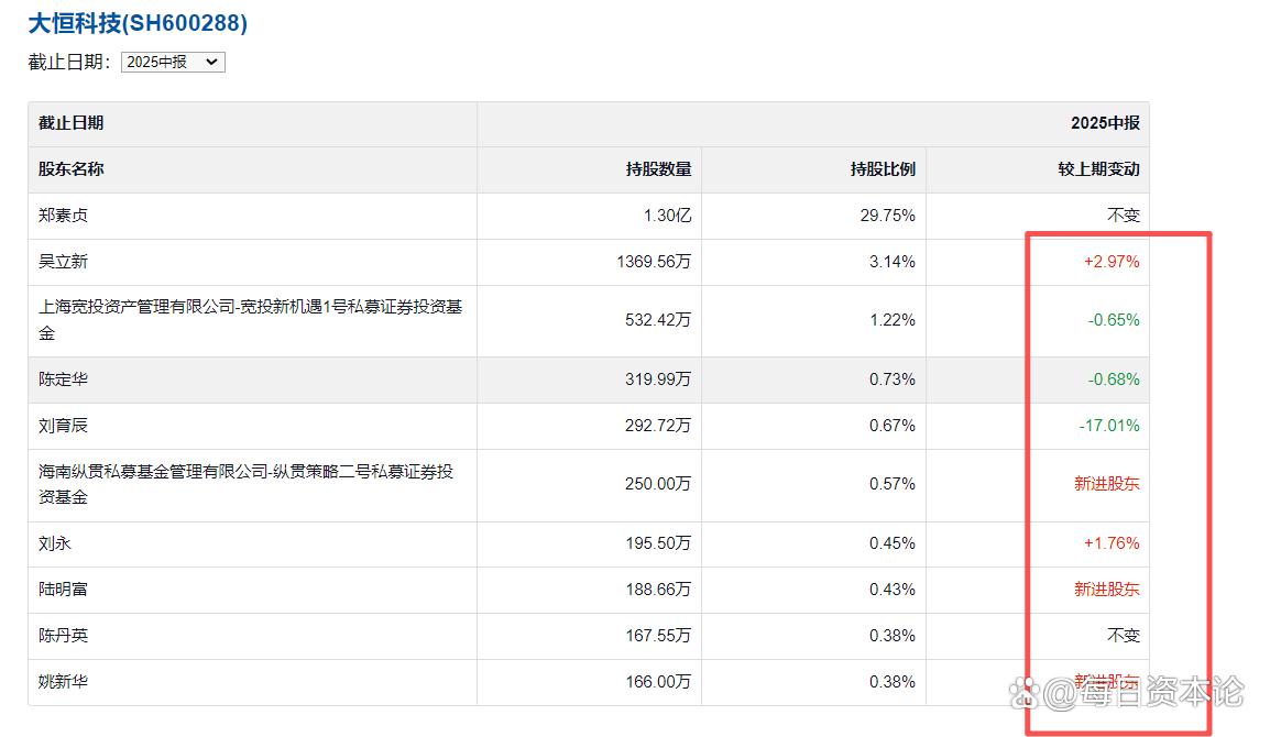 或让资本市场存在想象力的是,随着郑素贞的彻底退出,大恒科技的股东结构正在经历一场大换血。2025年中报显示,大恒科技十大流通股东发生了显著变化:3位股东新进,3位股东退出,2位股东增持,3位股东的持股减少。