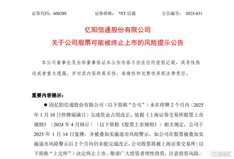 2月10日晚间,ST信通(600289)发布公告称,因未在停牌2个月内完成资金占用改正,公司股票被叠加实施退市风险警示。