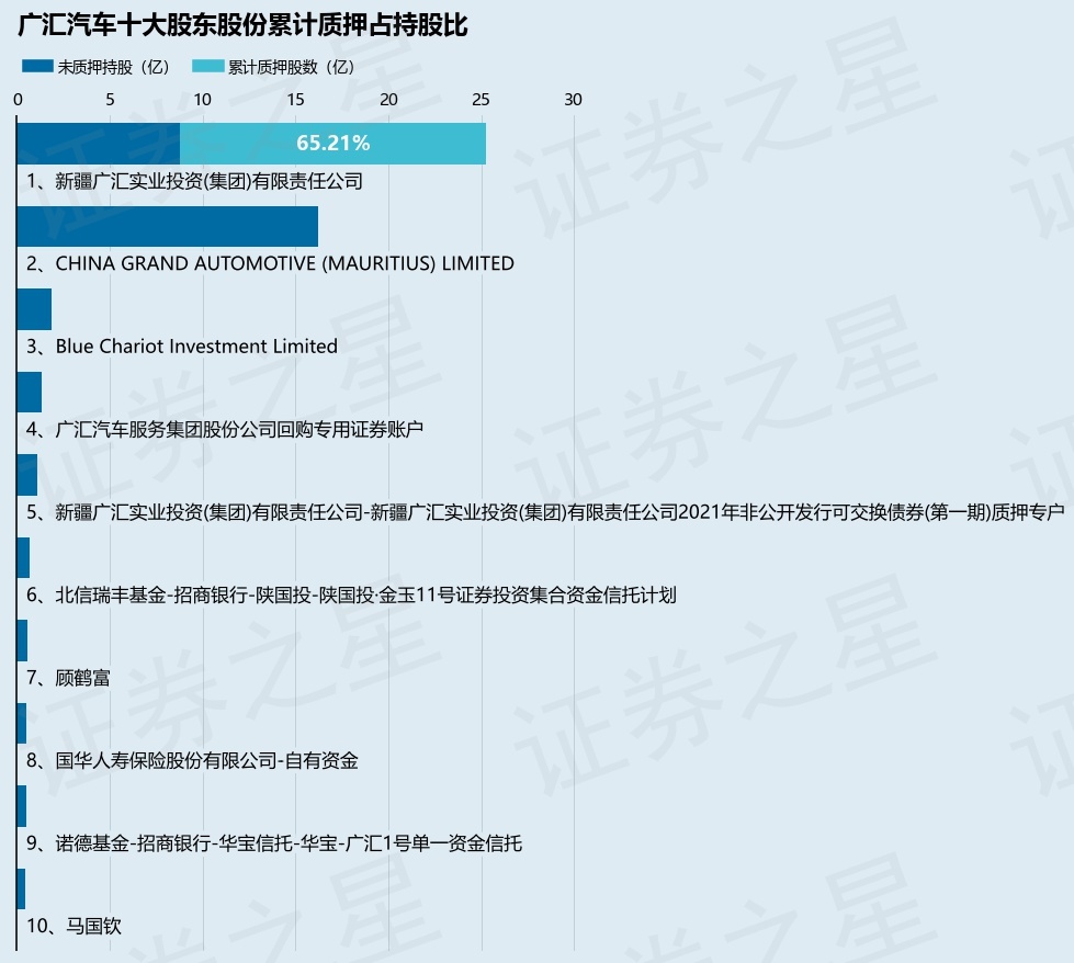 截止本公告日,股东新疆广汇实业投资(集团)有限责任公司已累计质押股份16.47亿股,占其持股总数的65.21%。本次质押后广汇汽车十大股东的累计质押股份占持股比例见下图: