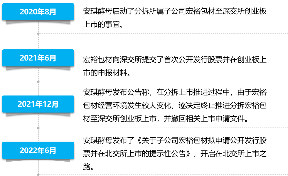 2022年6月,A股上市公司安琪酵母股份有限公司(以下简称“安琪酵母”)发布公告表示,其董事会正授权管理层启动对子公司湖北宏裕新型包材股份有限公司(以下简称“宏裕包材”)在北交所上市的前期筹备工作。