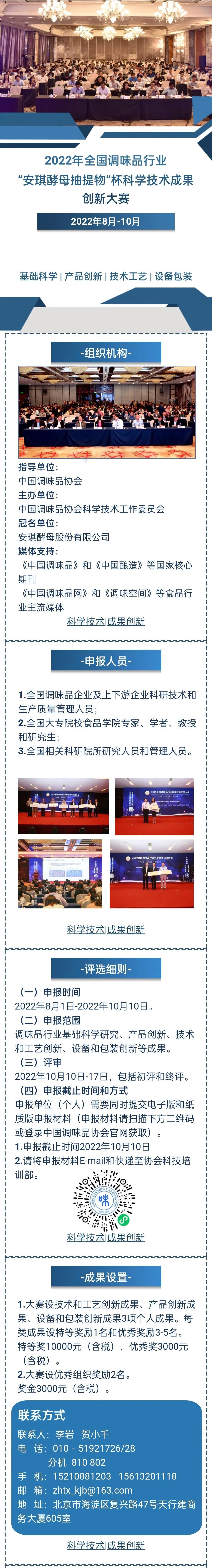 为调动各大专院校、科研院所、调味品生产及上下游企业的科技力量,促进优秀的科研课题与科研成果的转化,提高行业科学技术水平,中国调味品协会科学技术工作委员会决定继续开展2022年全国调味品行业“安琪酵母抽提物”杯科学技术成果创新大赛活动。