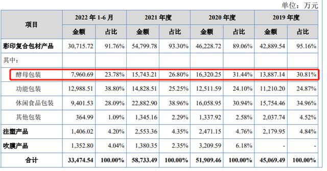 宏裕包材的主营业务为彩印复合包材产品,占比九成以上。其中,酵母包装占比三成左右。
