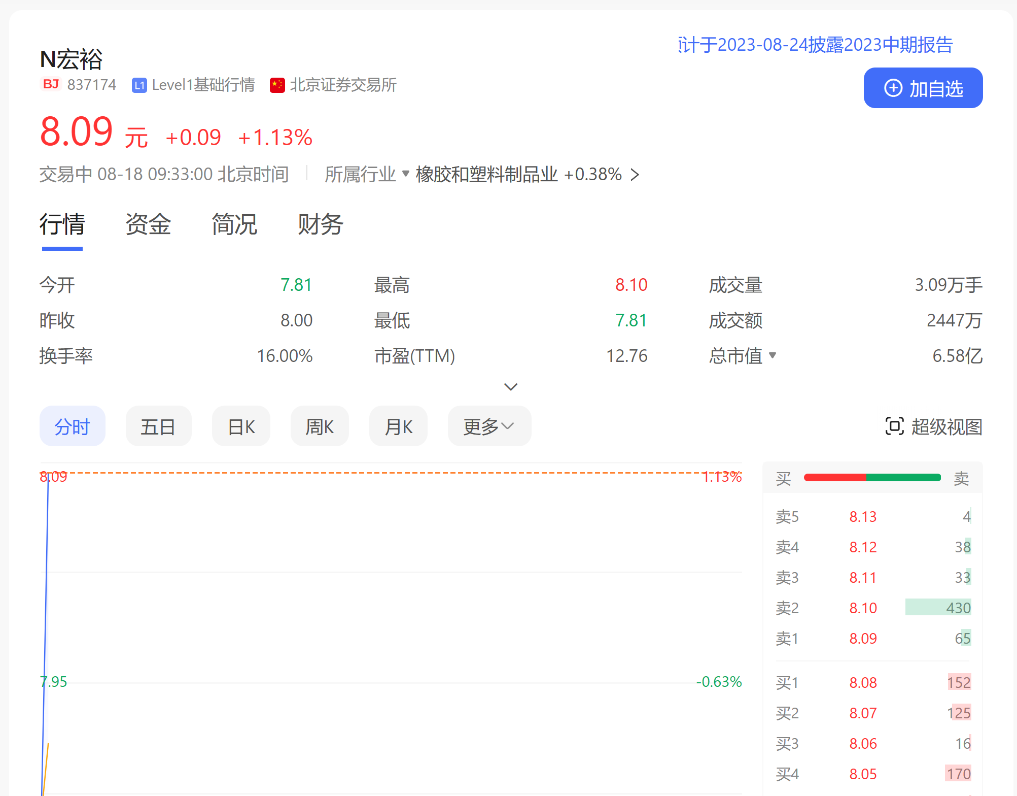 截至发稿时,宏裕包材涨1.13%,报8.09元每股,总市值6.58亿元。