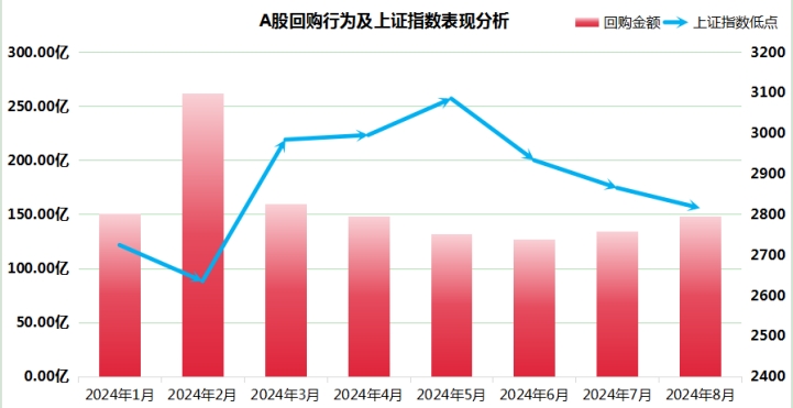 而在6月至8月期间,尽管上证指数连续收阴,最低下探至2815.38点,但上市公司的回购金额却并未因此减少,反而逐渐增加。8月的回购金额达到了148.23亿元,明显高于6月的127.32亿元和7月的134.70亿元。