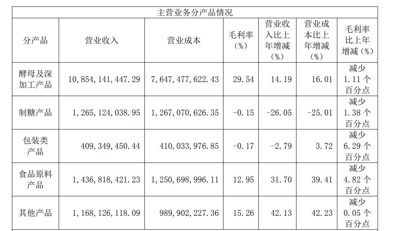 分产品来看,公司酵母及深加工产品去年实现营收108.54亿元,同比增长14.19%;制糖产品实现营收12.65亿元,同比下降26.05%;包装类产品实现营收4.09亿元,同比下降2.79%;食品原料产品实现营收14.37亿元,同比增长31.7%;其他产品实现实现营收为11.68亿元,同比增长42.13%。