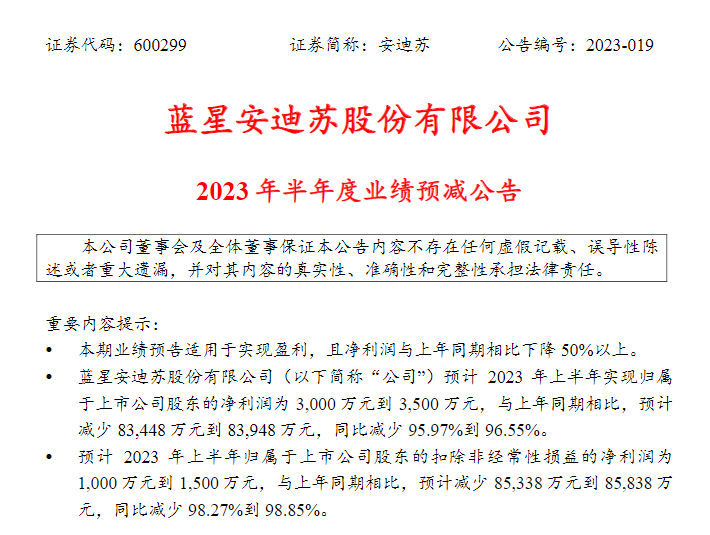 近日,安迪苏(600299.SH)公布2023年半年度业绩预减公告,经财务部门初步测算,预计2023年上半年实现归属于上市公司股东的净利润为3000万元到3500万元,与上年同期(法定披露数据)相比,将减少83448万元到83948万元,同比减少95.97%到96.55%。