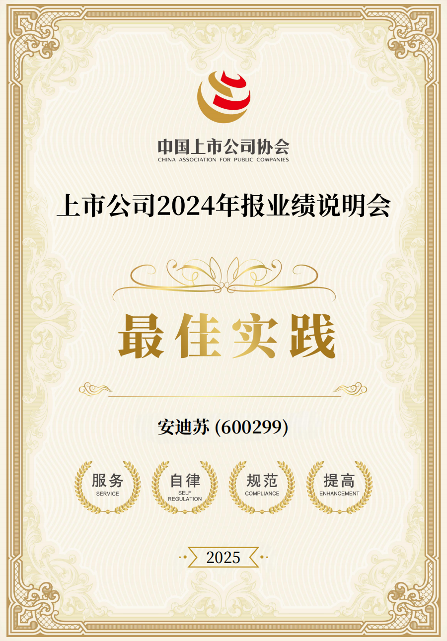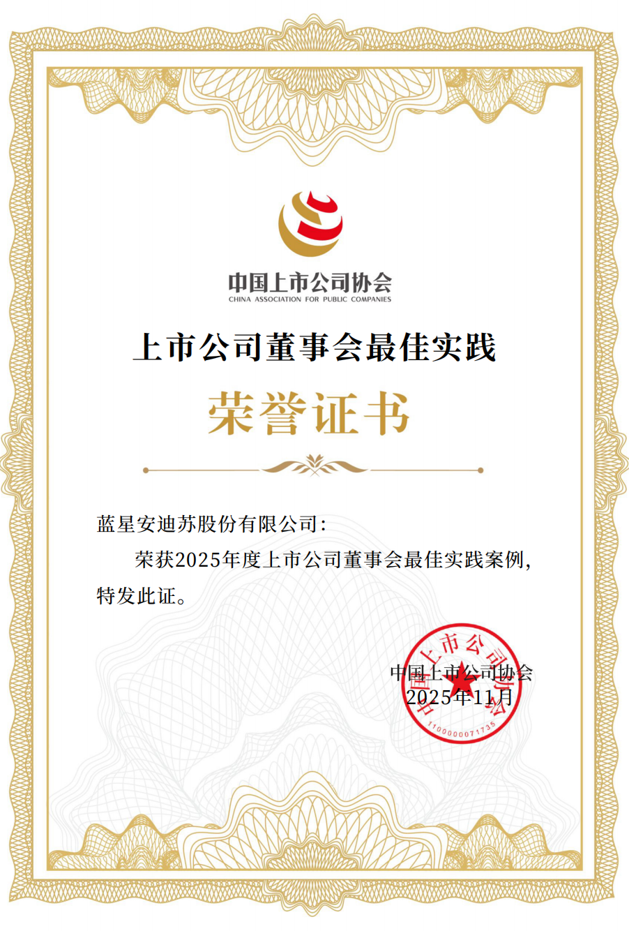 在中国上市公司协会2025年度评选中,安迪苏凭借卓越的综合治理实力,一举囊括五项重要荣誉。公司不仅成功入选“上市公司董事会最佳实践”“上市公司董事会办公室最佳实践案例”“上市公司投资者关系管理最佳实践”及“上市公司2024年报业绩说明会最佳实践”四项最佳实践名单,更荣获“上市公司董事会秘书履职5A评价”。这一系列成果,全方位体现了安迪苏在公司治理结构、董事会运作、董事会秘书履职、信息披露及投资者关系等关键领域的突出表现,标志着公司在规范化、专业化与精细化治理方面已达到行业领先水平,进一步提升了公司在资本市场的公信力与影响力。