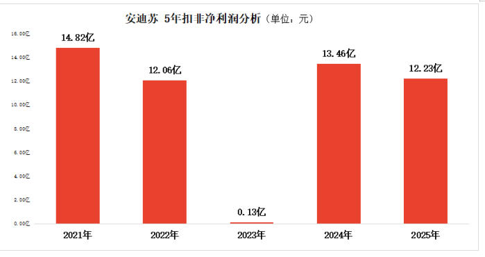 从核心经营数据来看,安迪苏2025年盈利表现明显不及上年,2024年公司扣非净利润为13.46亿元,2025年降至12.23亿元,同比下滑幅度达到9.18%。