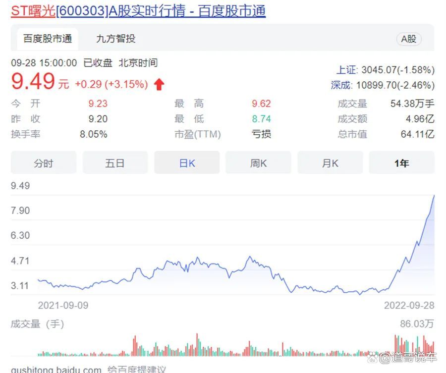 8月12日,彼时的ST曙光股价仅3.7元/股,而到了9月28日,ST曙光股价竟然达到了9.49元/股,根据ST曙光发布公告,该公司股票自2022年8月12日起至2022年9月21日收盘,累计涨幅达到126.14%,其中20个交易日涨停。而到了9月21日复牌之后,该公司股价又在累计涨幅达到25.20%,并新增了3条涨停记录。