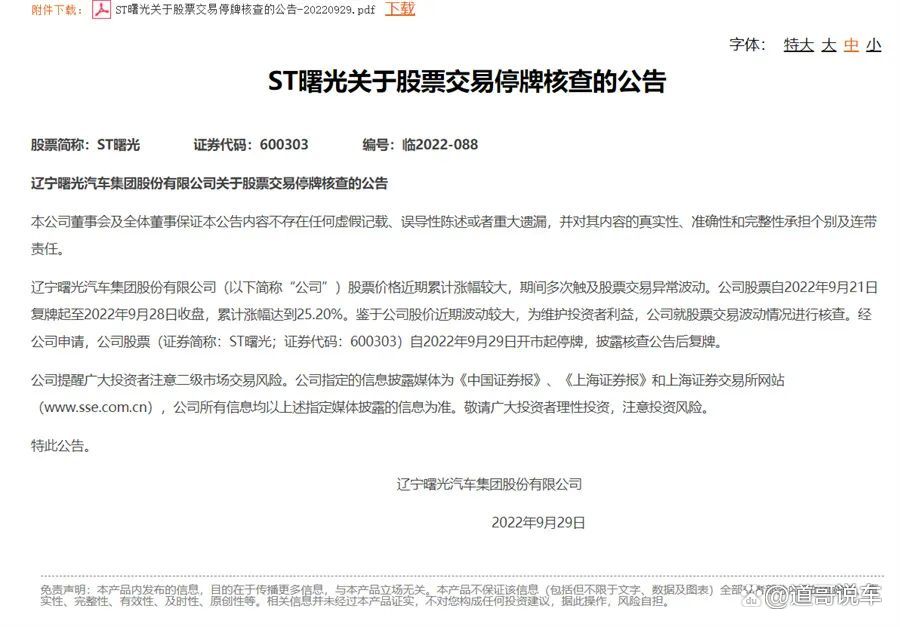 9月26日,ST曙光发布公告称,鉴于公司股价近期波动较大,为维护投资者利益,公司就股票交易波动情况进行核查。经公司申请,公司股票自2022年9月29日开市起停牌,披露核查公告后复牌。