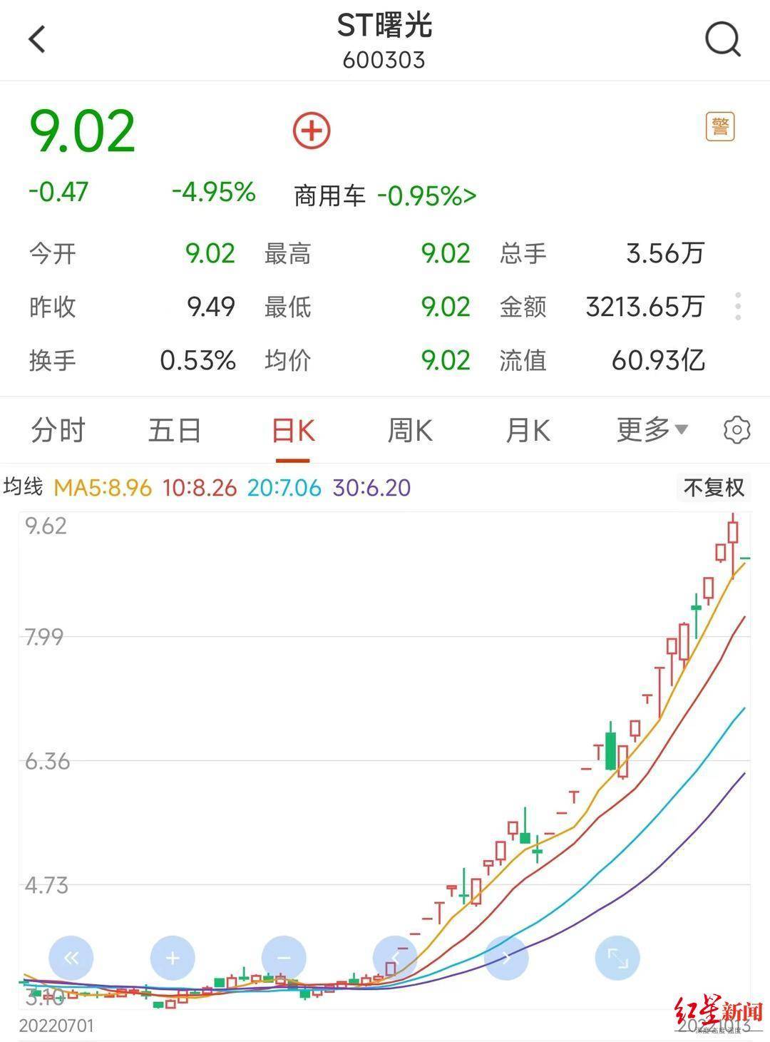 10月13日,ST曙光开盘即跌停。截至收盘,ST曙光报收9.02元/股,跌4.95%,总市值60.94亿元。不过,较7月1日的开盘价3.46元/股,ST曙光自7月以来的股价涨幅仍超过160%。