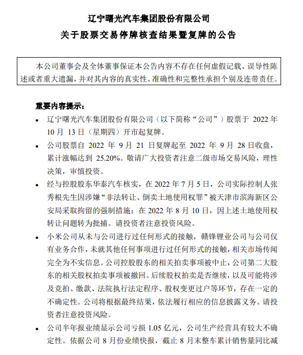 ST曙光在复牌公告中表示,2022年上半年,公司亏损1.05亿元,公司生产经营具有较大不确定性。依据公司8月份业绩快报,截止8月末整车累计销售量同比减少52.67%,车桥累计销量同比减少12.18%。公司新能源乘用车产品能否实现量产、量产的时间、市场前景以及产品竞争力存在不确定性,请投资者注意投资风险。