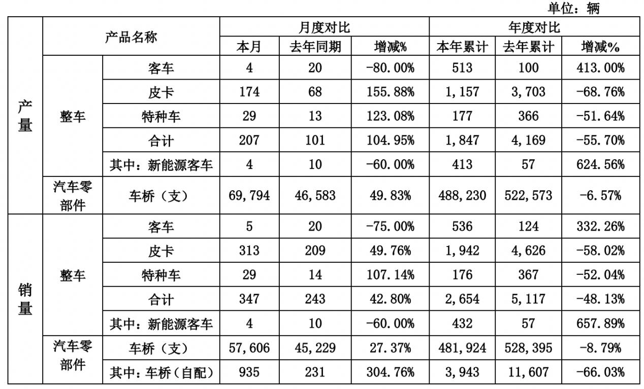 10月13日,ST曙光(SH600303)公告,公司9月整车合计产量为207辆,同比增加104.95%,前9月合计产量为1847辆,同比减少55.7%;9月整车合计销量为347辆,同比增加42.8%,前9月合计销量为2654辆,同比减少48.13%。