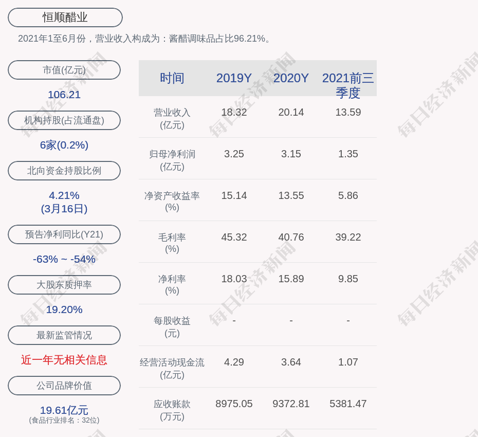 2021年1至6月份,恒顺醋业的营业收入构成为:酱醋调味品占比96.21%。