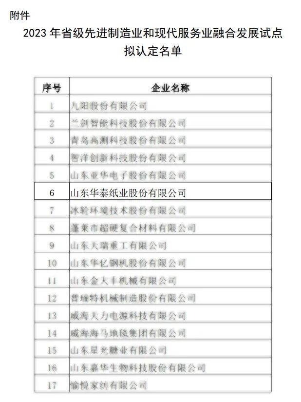 11月9日,华泰股份入选山东省2023年省级先进制造业和现代服务业融合发展试点拟认定名单,是全省造纸行业唯一一家入选的企业。