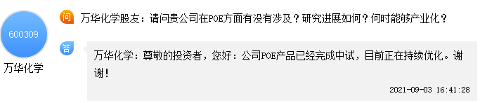 9月3日,万华化学在于投资者互动中表示:公司POE产品已经完成中试,目前正在持续优化。