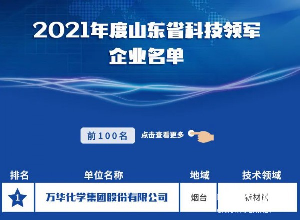 10月29日,2021年度山东省科技领军企业名单发布,万华化学凭借优异的创新发展绩效位列全省200家科技领军企业第一名!