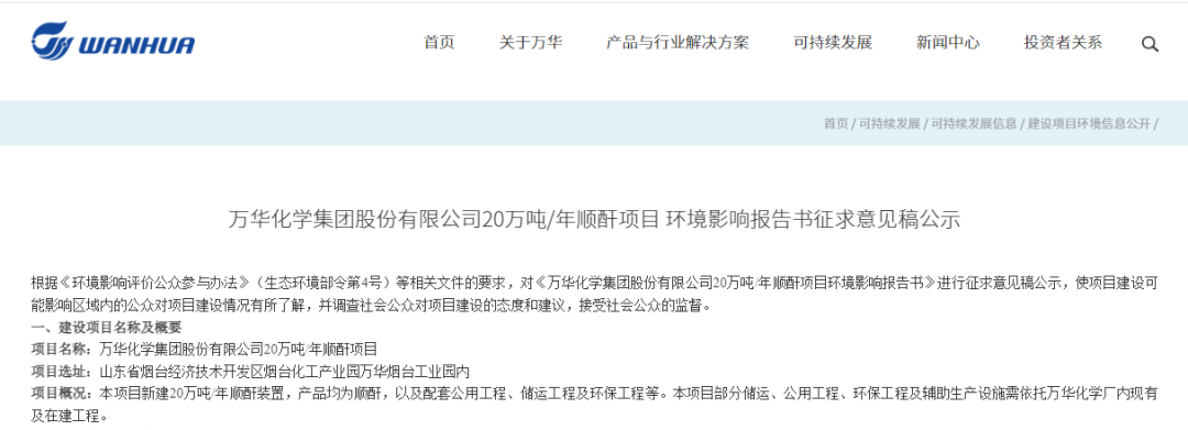 今日,万华化学官网公示了20万吨/年顺酐项目环境影响报告书征求意见稿。
