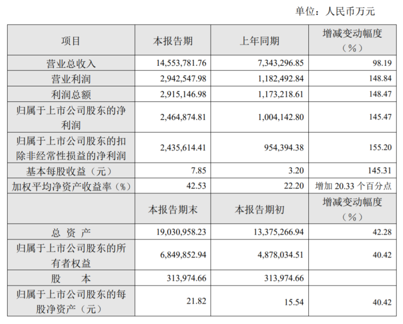 3月8日,化工龙头企业万华化学集团股份有限公司(万华化学,600309)公告:2021年公司实现营业收入1455.38亿元,同比增长98.19%;净利润246.49亿元,同比增长145.47%;基本每股收益7.85元。