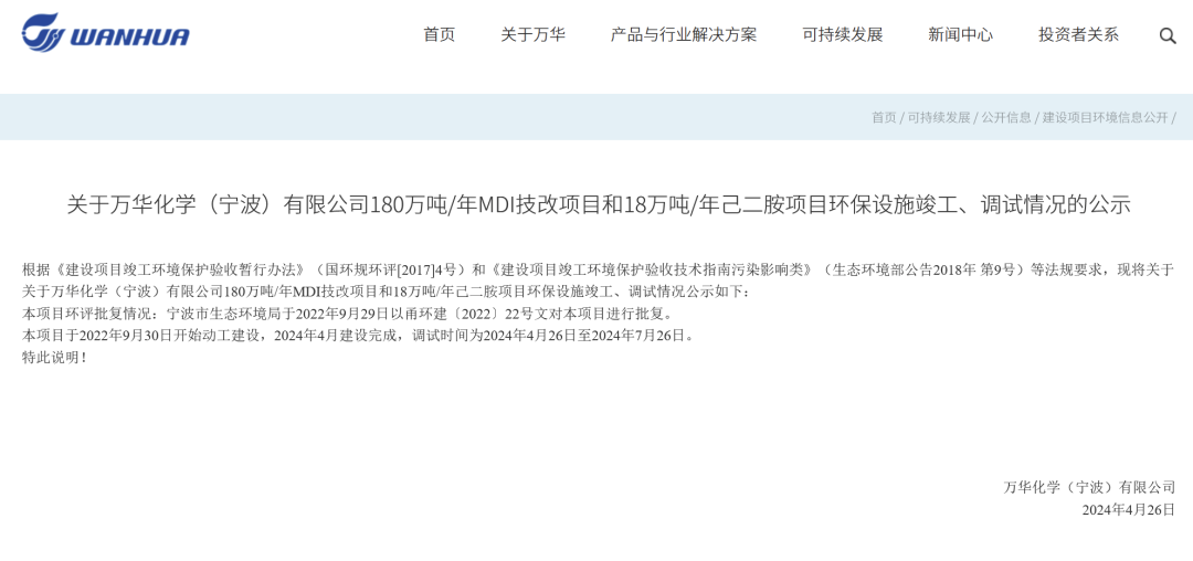 获悉,4月26日,万华化学宣布万华化学(宁波)有限公司180万吨/年MDI技改、18万吨/年己二胺项目,MDI/HDI技改扩能一体化项目,5万吨水性树脂项目环保设施竣工,进入调试阶段,预计7月完成调试。