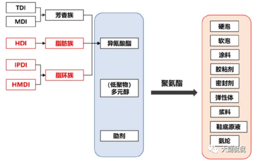 脂肪族异氰酸酯简称ADI,是生产高档聚氨酯的核心原料,代表性品种有异佛尔酮二异氰酸酯(IPDI)、1,6-六亚甲基二异氰酸酯(HDI)和二环己基甲烷二异氰酸酯(H12MDI)。以其制备的聚氨酯材料因具有极其优异的抗老化、耐暴晒、耐黄变性能,是支撑航天军工、高端装备、汽车等产业发展的关键性基础材料。