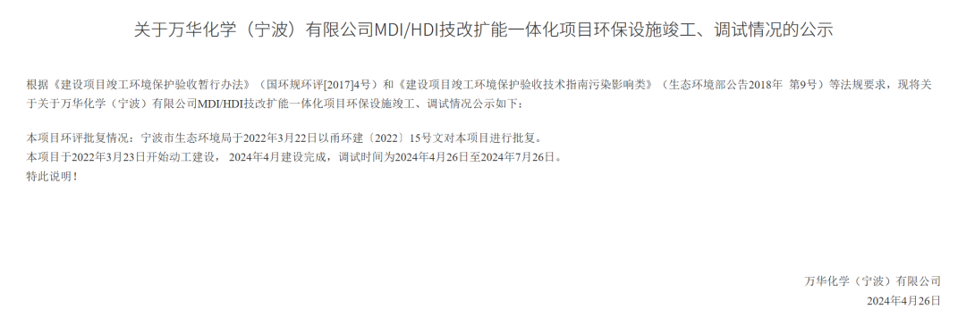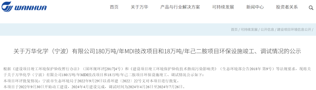 2021年,万华化学官网发布了万华化学(宁波)有限公司MDI/HDI技改扩能一体化项目和180万吨/年MDI技改项目环境影响评价信息公开公告。