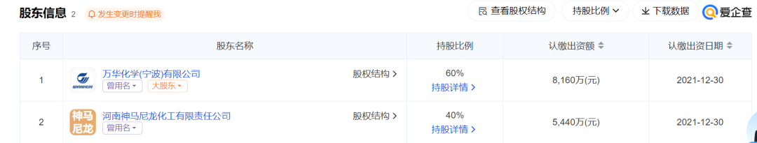 据爱企查显示,华神新材料(宁波)有限公司成立于2021年8月18日,注册资本13600万元,万华化学(宁波)有限公司股权占比60%,河南神马尼龙化工有限责任公司占比40%。