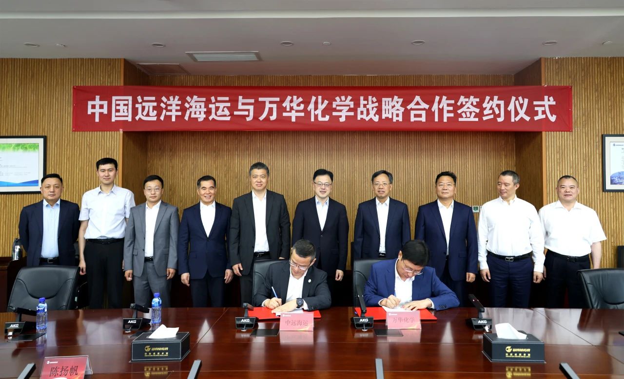 6月12日,万华化学集团股份有限公司(以下简称“万华化学”)与中国远洋海运集团(以下简称“中国远洋海运”)签署战略合作协议。中远海运董事长万敏,万华化学董事长廖增太、总裁寇光武等出席仪式。