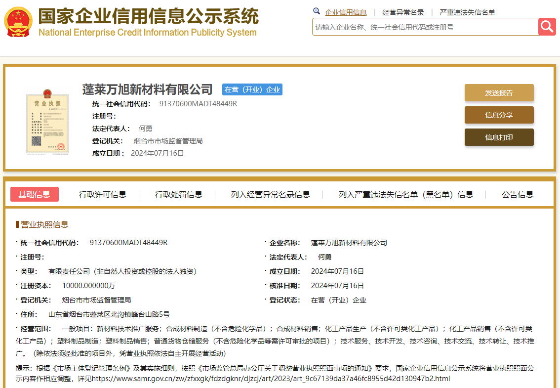 7月18日,记者从国家企业信用信息公示系统获悉,蓬莱万旭新材料有限公司已于7月16日成立,法定代表人为何勇,注册资本1亿元。其经营范围包含新材料技术推广服务、合成材料销售、塑料制品制造等。股权穿透显示,该公司由上市公司万华化学旗下烟台万旭新材料有限公司全资持股。